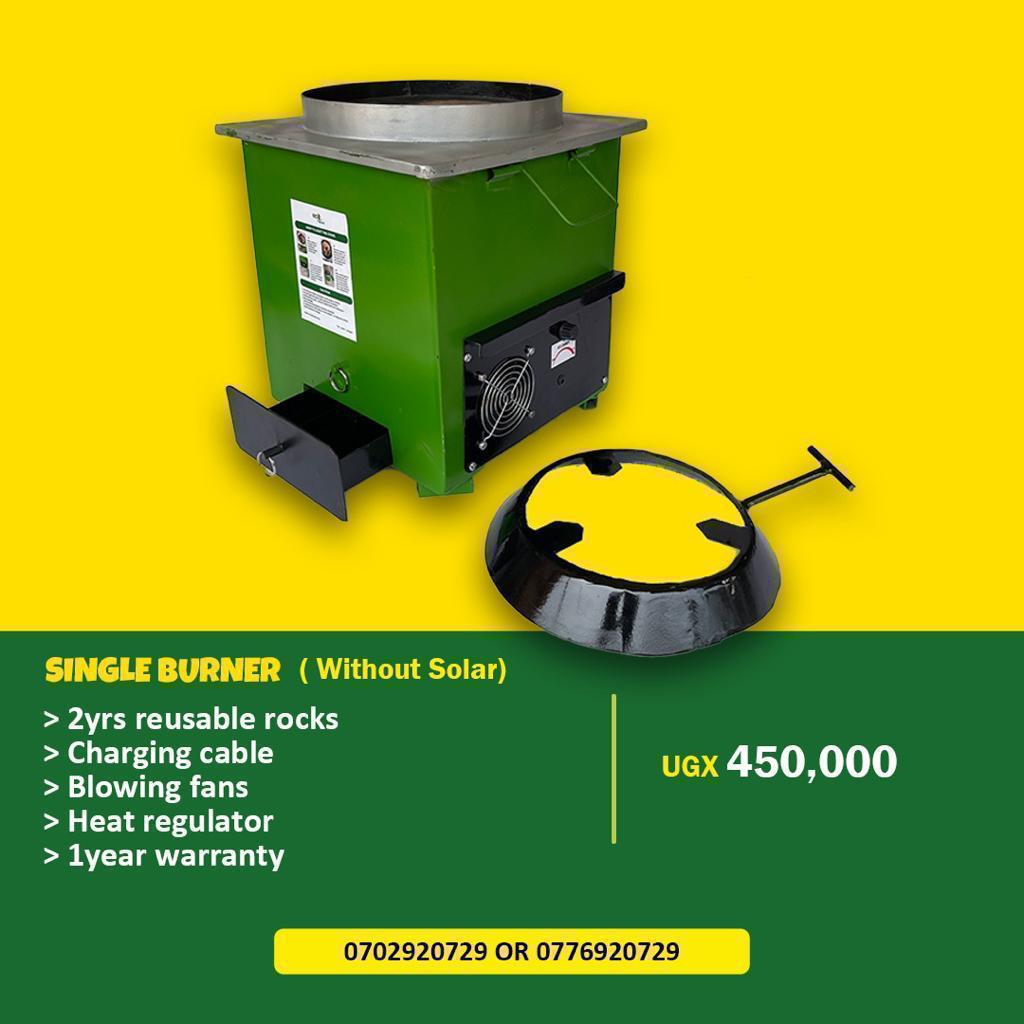 A complete Single Eco stove Burner comes with 2-year reusable Volcanic rocks, Blowing fans, a Power adapter, and a 1-year warranty.